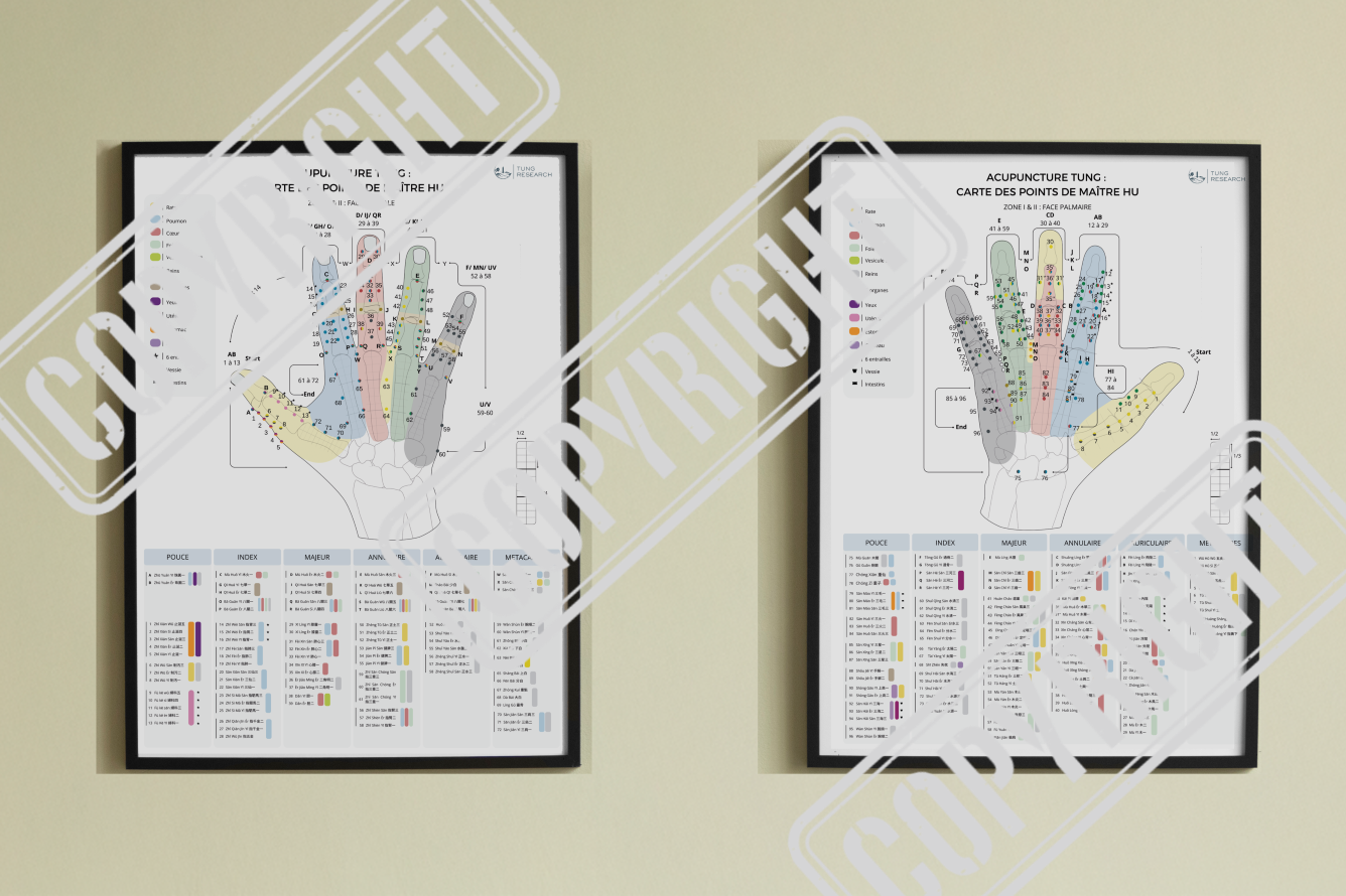 Acupuncture TUNG : carte des points de maître HU (Face dorsale et face palmaire)